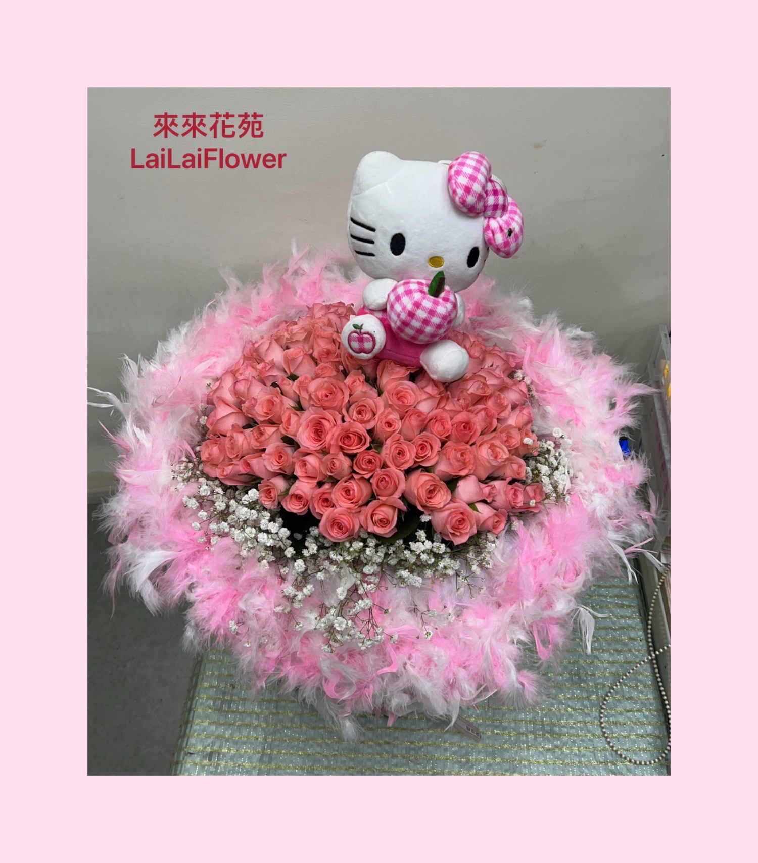 產品編號:B57 ﹋﹋﹋﹋﹋﹋﹋ (歡迎來電詢價) 《花材說明》 粉玫瑰99朵+KITTY+羽毛 備註標示: ⊙外縣市及較偏遠地區 須另加運費 ⊙如遇季節因素、及外縣市配送 ⊙無上述花材.包裝時將以同等花材.包裝替代。 特殊備註:情人節價格另議