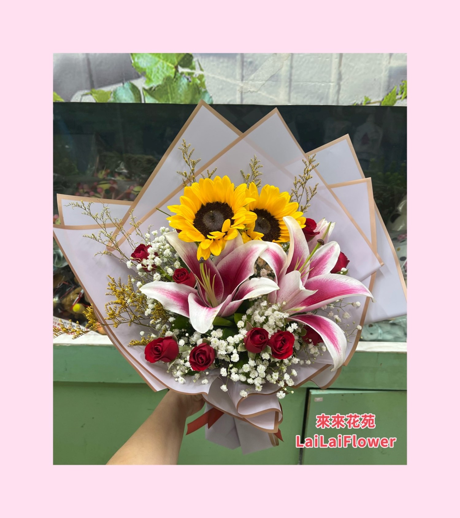 產品編號:B65 ﹋﹋﹋﹋﹋﹋﹋ 《花材說明》 向日葵+紅百合+紅玫瑰9朵 備註標示: ⊙外縣市及較偏遠地區 須另加運費 ⊙如遇季節因素、及外縣市配送 ⊙無上述花材.包裝時將以同等花材.包裝替代。 特殊備註:情人節價格另議